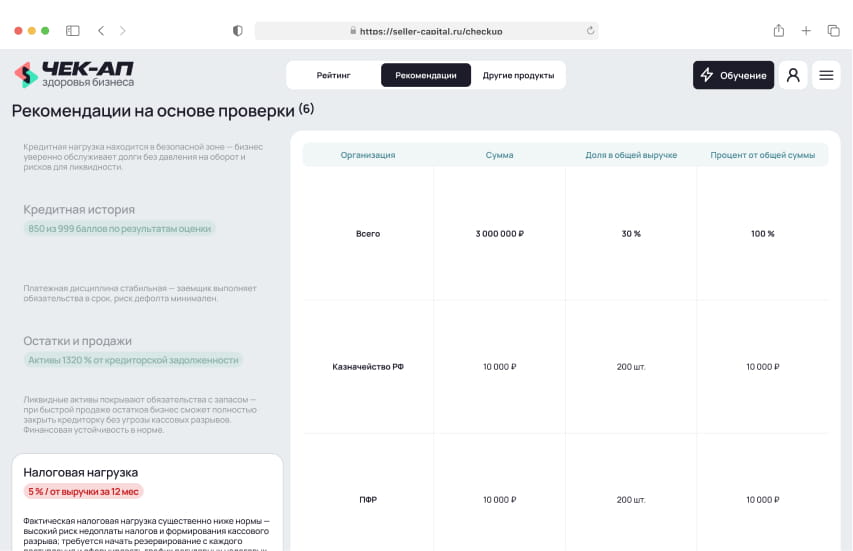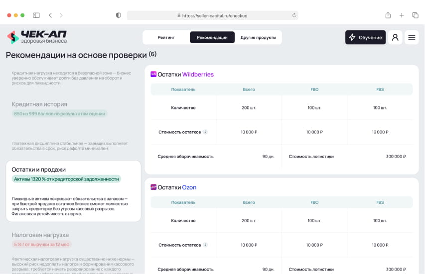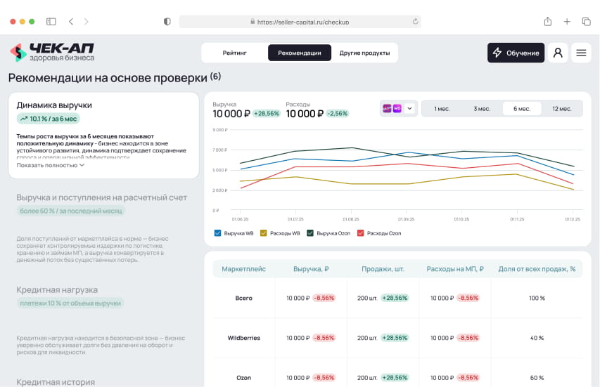 Чек-ап здоровья бизнеса от Seller Capital — финансово-управленческая диагностика за 15 минут, которая показывает реальное состояние бизнеса на маркетплейсах Результат чек-апа — персональный аналитический отчёт с ключевыми финансовыми метриками, динамикой показателей и рекомендациями по росту и стабилизации